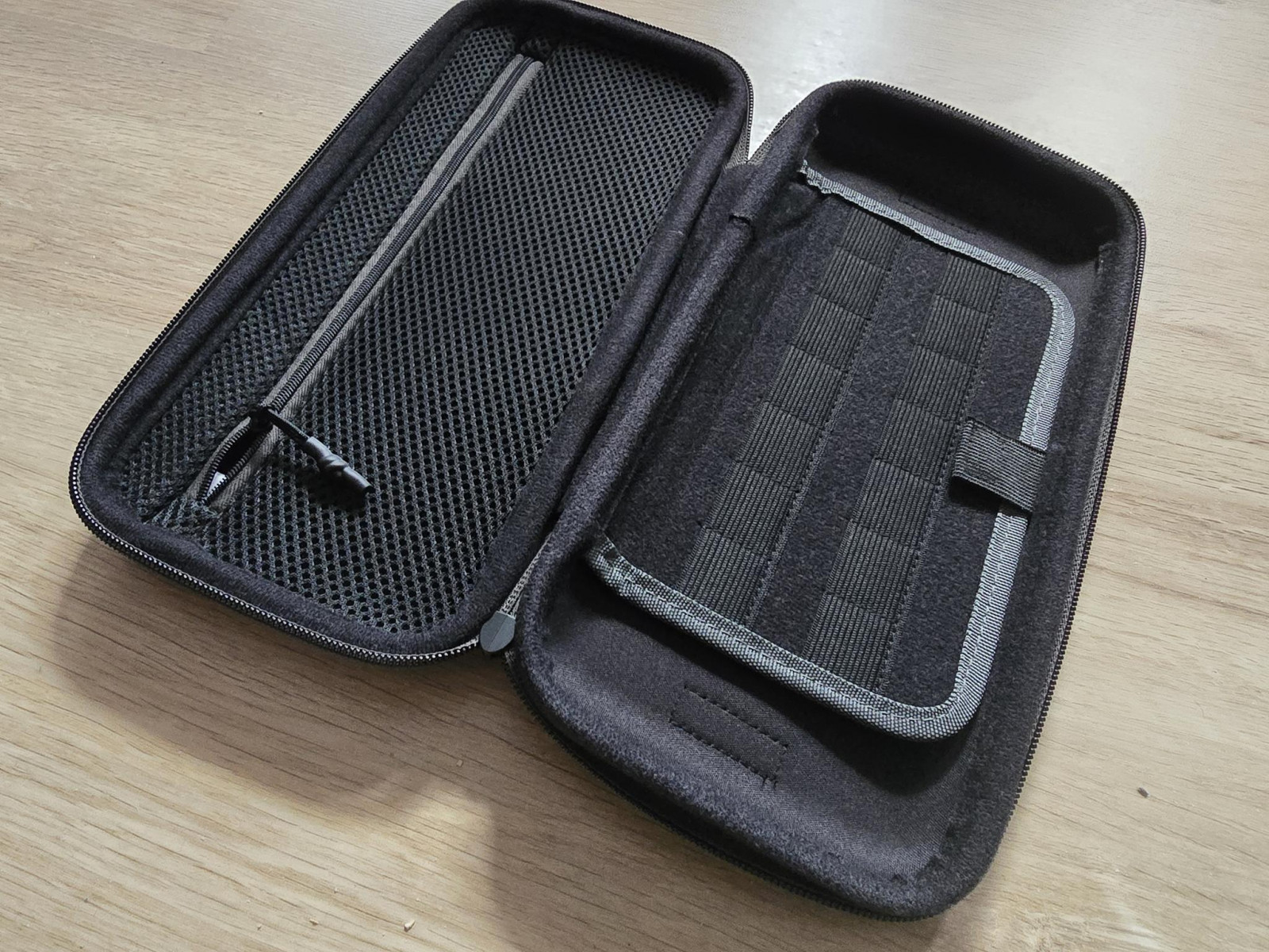 Zajrzyjmy do środka, bo tutaj dzieje się najwięcej magii organizacyjnej. Górna część, dedykowana samej konsoli, wyposażona jest w wyściełaną klapkę chroniącą ekran, która pełni również funkcję magazynu na karty z grami. Znajdziemy tu też zamykaną na zamek kieszonkę z siatki na drobne akcesoria.