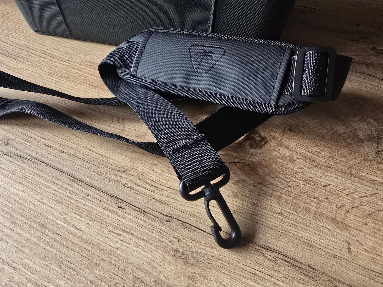 Biorąc pod uwagę, że w pełni załadowany PlayTrek może ważyć sporo (etui + konsola + dock + pady), producent zadbał o wygodę noszenia. Mamy do dyspozycji solidny uchwyt wykończony neoprenem, który nie wrzyna się w dłoń. Dodatkowo w zestawie znajduje się regulowany pasek na ramię, dzięki czemu etui zamienia się w funkcjonalną torbę na ramię. To drobny detal, który drastycznie poprawia komfort, gdy mamy już zajęte ręce innym bagażem.