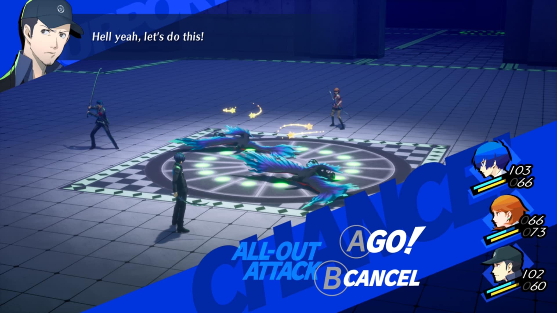 Walka ma bardzo proste założenia. W trakcie tury możemy wykonać jedną akcję – użyć przedmiot, uderzyć bronią, zaatakować Personą lub wejść w postawę obronną. Pozornie ogranicza nas jedna akcja, lecz w walce warto wykorzystywać osłabienia przeciwników. Jeśli trafimy w czuły punkt, możemy wykonać dodatkową akcję lub przekazać ją sojusznikowi. Jeśli sojusznik również trafi w czuły punkt, także otrzymuje dodatkową akcję, więc efekty kumulują się. Gdy trafimy wszystkich przeciwników w słaby punkt, możemy użyć specjalnego ataku (All-Out Attack), w którym wszyscy bohaterowie atakują jednocześnie.