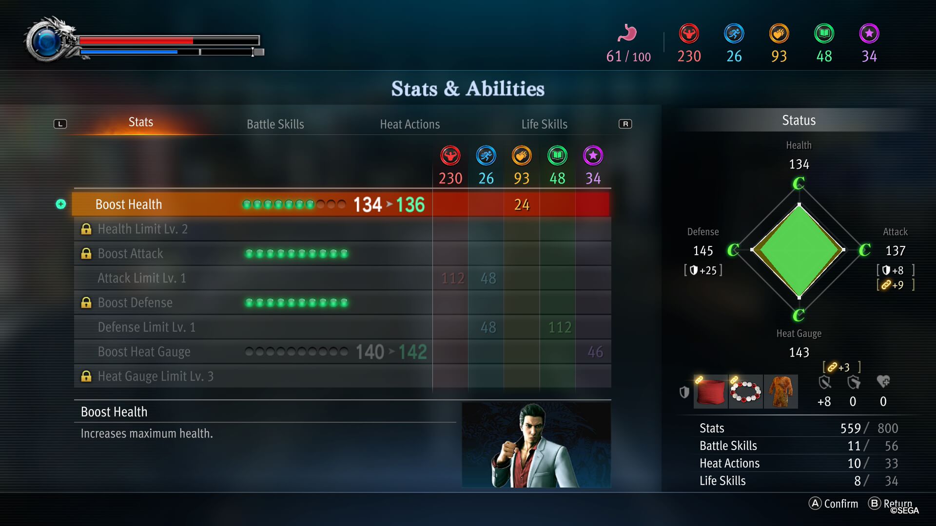 Na plus wypadają też zmiany w mechanice i samym interfejsie. Menu jest bardziej współczesne i przejrzyste. Łatwo sprawdzić statystyki Kiryu, a rozwijanie umiejętności stało się bardziej intuicyjne. System nie jest jednak idealny. Podział punktów na pięć odrębnych kategorii bywa uciążliwy. Często brakowało mi jednej sekcji, by ulepszyć wybraną zdolność. Jedna wspólna pula byłaby po prostu wygodniejsza i pozwoliłaby uniknąć niepotrzebnych blokad.