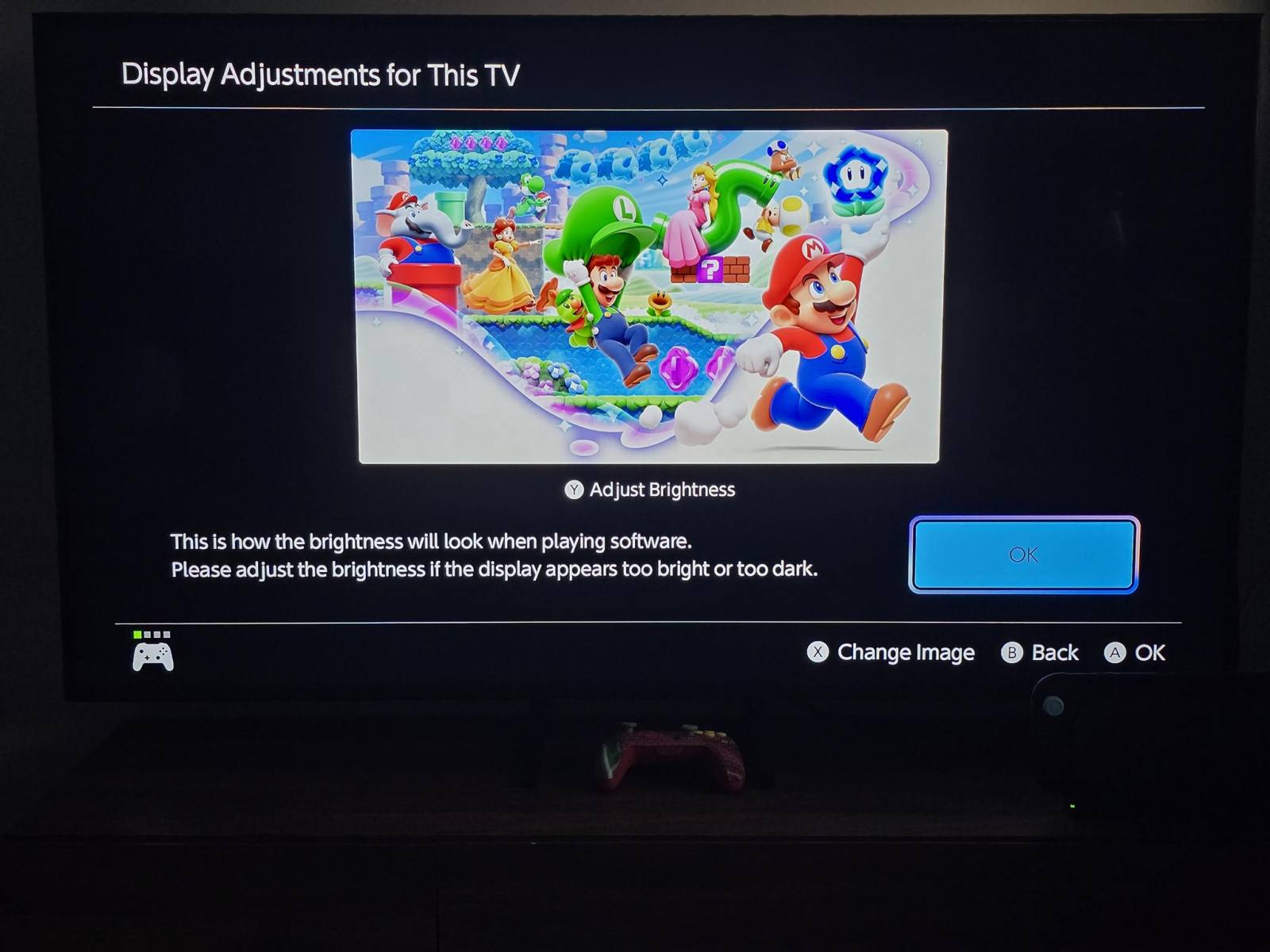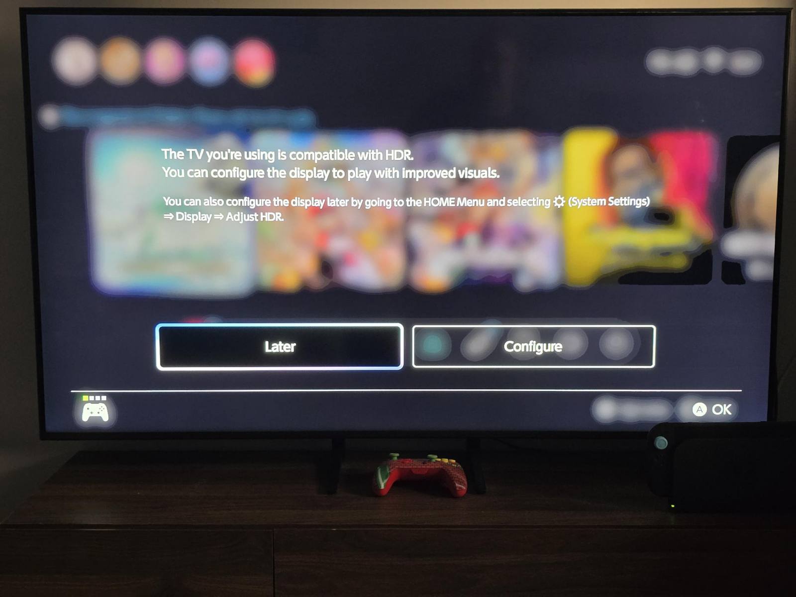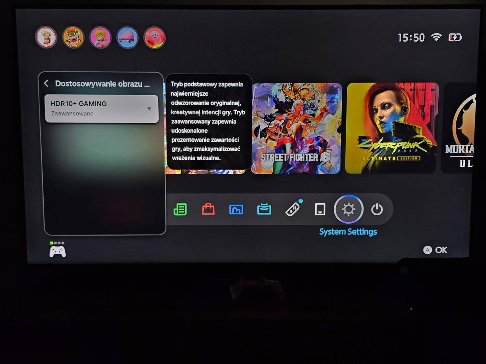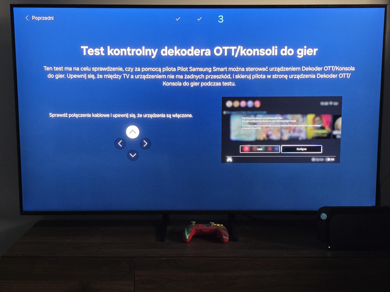 Podłączenie Nintendo Switch 2 to moment, w którym pojawiła się pierwsza rysa na tym gamingowym pancerzu. Telewizor nie rozpoznał konsoli jako „Nintendo Switch 2”. W źródłach po prostu widnieje jako „HDMI 1-2-3-4”. To tak, jakbyś wsiadł do supersamochodu, a ten nie rozpoznał kluczyka. Na szczęście, po ręcznym wejściu w ustawienia portu i aktywowaniu „Xbox 🤣”, wszystko wróciło do normy. Po podłączeniu konsoli Nintendo Switch 2, na ekranie telewizora od razu pojawił się systemowy kreator konfiguracji HDR. Konsola, w porozumieniu z telewizorem, przeprowadziła nas przez proces optymalnego ustawienia wyświetlania czerni i jasności, aby zapewnić jak najlepsze doznania wizualne od samego początku. To niezwykle proste i intuicyjne, a efekt jest od razu widoczny.