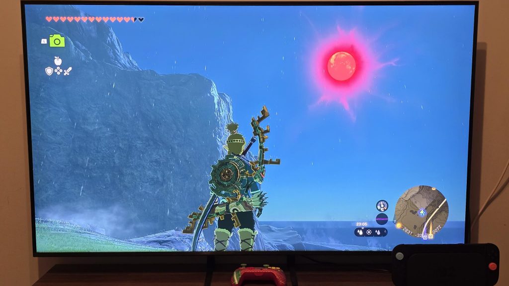 3. Zelda: Tears of the Kingdom: Ogromne, otwarte Hyrule wyglądają niesamowicie soczyście dzięki wysokiemu kontrastowi. Zielone równiny, mroczne jaskinie i ośnieżone szczyty mają wspaniałą głębię. Podczas szybowania na paralotni obraz jest stabilny i szczegółowy. Automatyczny Tryb Gry AI działał tu bez zarzutu, optymalizując jasność i kolorystykę pod kątem tej specyficznej gry, gdzie raz jesteś w przestworzach, a za kilka minut przemierzasz podziemia.