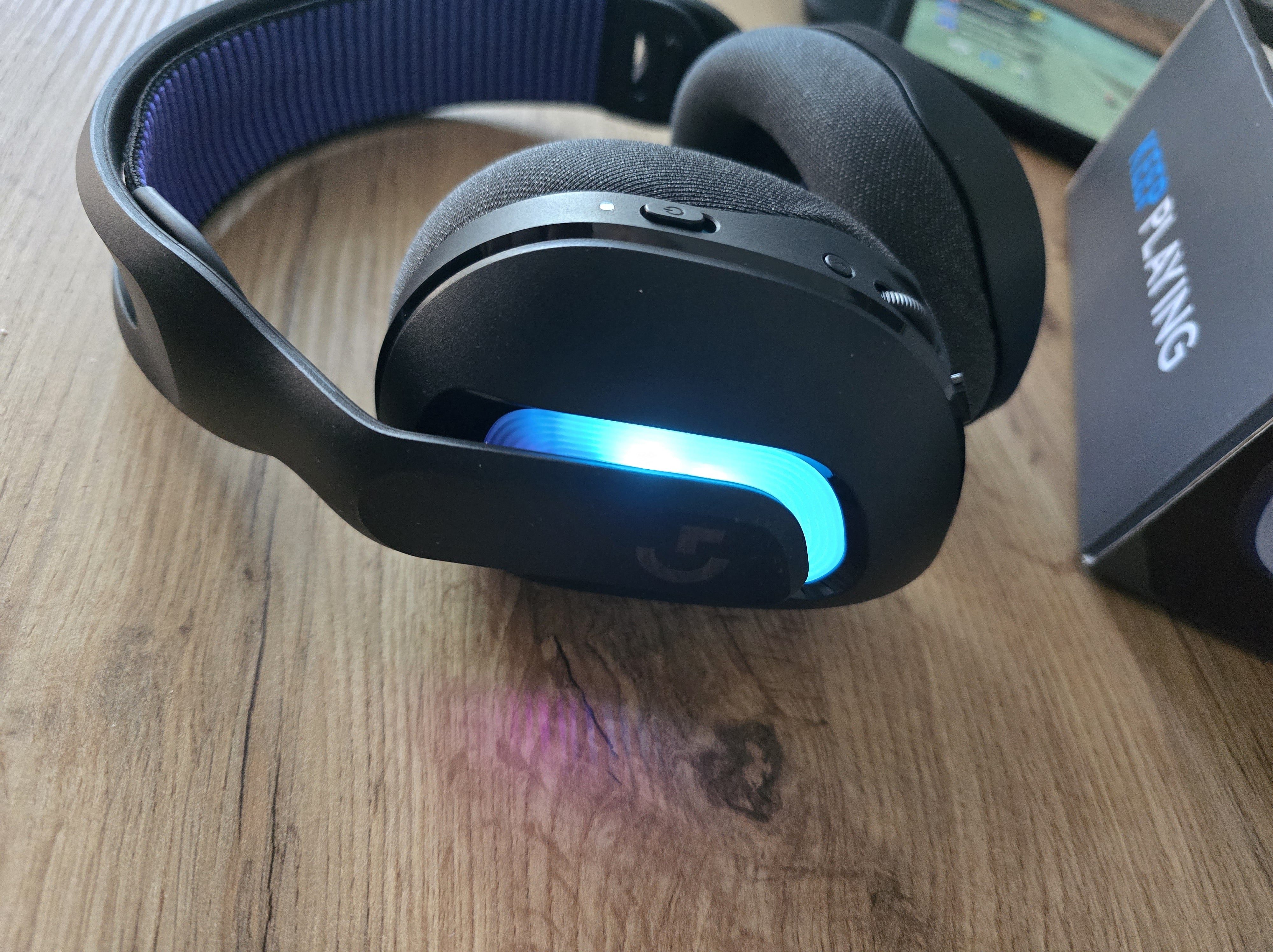 Oświetlenie RGB w modelu G522 jest przemyślane. Umieszczone jest z boku miseczek, co ma dwie zasadnicze zalety: po pierwsze, nie odbija się irytująco w soczewkach osób noszących okulary; po drugie, emanuje subtelnym, pośrednim blaskiem, który jest estetyczny bez bycia rozpraszającym. Przez darmową komputerową aplikację Logitech G HUB (lub G na smartfonach) użytkownik zyskuje pełną kontrolę nad oświetleniem: od wyboru spośród milionów kolorów, przez różne efekty (fala, oddychanie, cykl kolorów), aż po całkowite jego wyłączenie dla oszczędzania baterii. Aplikacja służy również jako centralny punkt sterowania dla wszystkich ustawień dźwięku, mikrofonu z BLUE VO!CE i gotowych presetów EQ.
