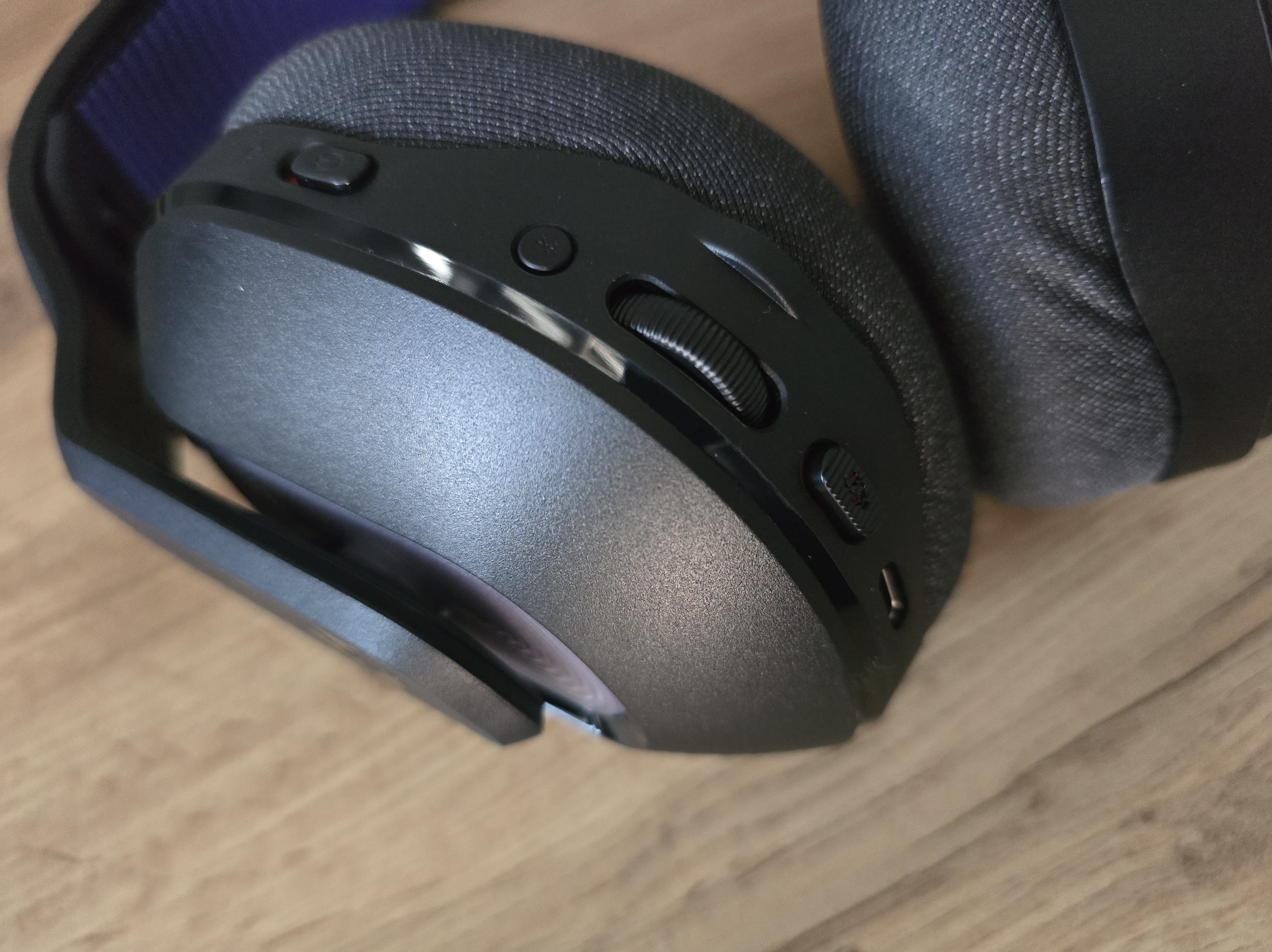 Słuchawki Logitech G522 zostały wyposażone w intuicyjny i funkcjonalny układ sterowania, umieszczony na lewej miseczce. Znajdziemy tam przede wszystkim przełącznik zasilania, nieopodal znajduje się dedykowany przycisk parowania Bluetooth. Głośność reguluje się za pomocą płynnie działającego pokrętła, które kryje w sobie ciekawy patent – nawet po osiągnięciu maksymalnego poziomu głośności pokrętło nadal się obraca, a słuchawki sygnalizują ten fakt charakterystycznym dźwiękiem, informując użytkownika o granicy. Tuż obok umieszczono przycisk wyciszenia mikrofonu z tactile feedback. Całość uzupełnia port USB-C do ładowania oraz wejście AUX na odłączany mikrofon, co zapewnia wygodę i porządek.