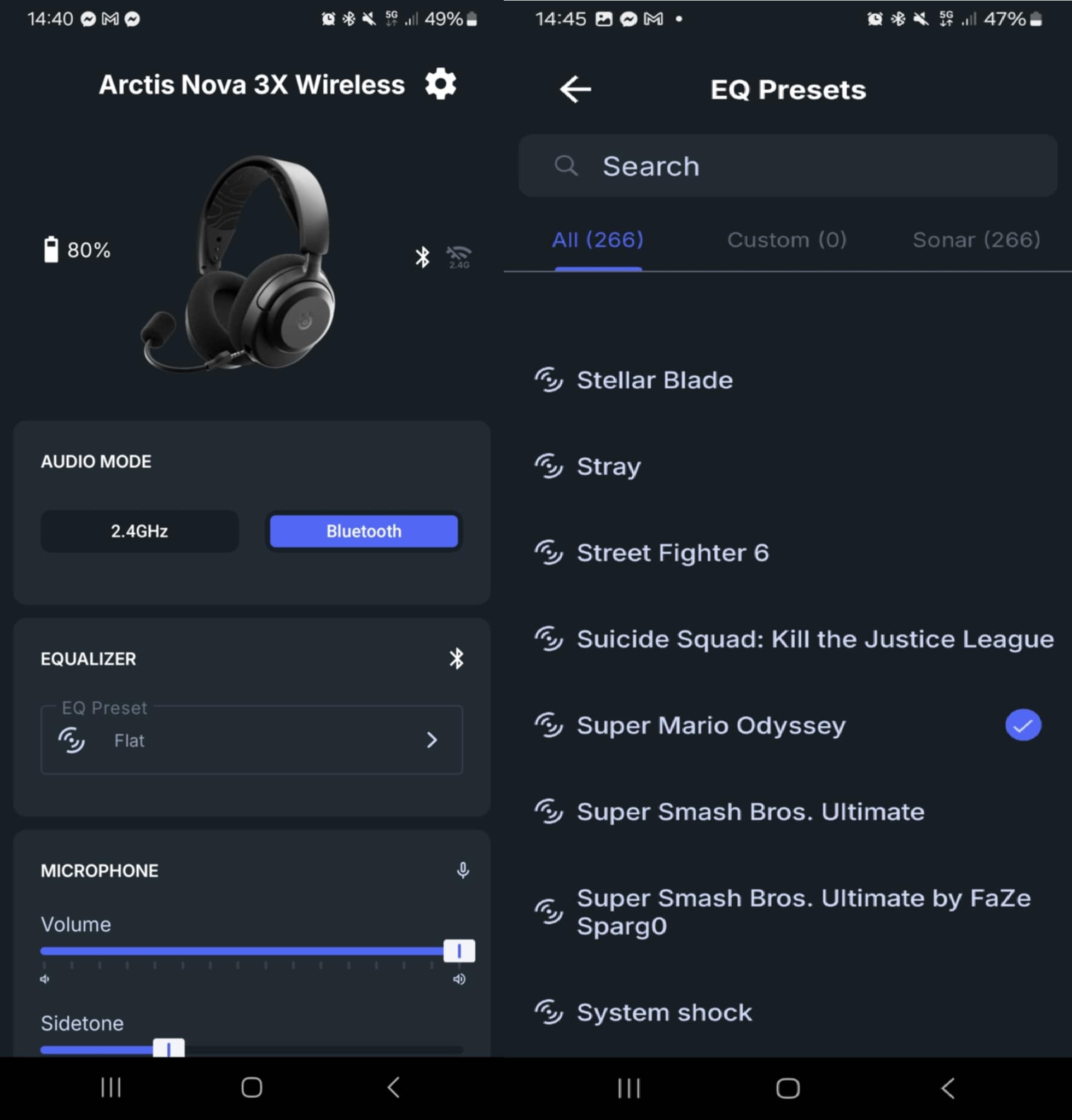 SteelSeries dla słuchawek Arctis Nova 3X Wireless ma również do zaproponowania coś więcej niż podstawowe funkcje, z którymi zderzamy się przy pierwszym ich uruchomieniu. Dzięki dedykowanej aplikacji – SteelSeries Arctis Companion, dostępnej na Androida oraz iOS – mamy możliwość korzystania z ponad 200 presetów EQ do różnych gier, w tym tytułów ekskluzywnych od Nintendo, takich jak Mario Kart World. Gotowe ustawienia dźwięku zmieniają sposób, w jaki słyszeć będziemy różne częstotliwości: od najniższych basów, przez średnie tony, aż po wysokie. Odpowiednio dopasowany preset do gry pozwoli na większe zaangażowanie w przedstawiony świat — przykładowo, FPS Footsteps podbija środkowe częstotliwości, sprawiając, że kroki w grach typu FPS będą słyszalne wyraźniej. Szybka, mobilna personalizacja ustawień pozwala stworzyć osobny profil dla połączenia 2.4 GHz oraz Bluetooth.